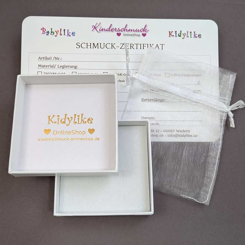 Die Sicherheit von Kindern liegt uns sehr am Herzen, daher werden für die Herstellung unserer Schmuckstücke ausschließlich hochwertige Materialien verwendet. Babys und Kleinkinder sollten Schmuck dennoch nicht unbeaufsichtigt tragen. Schmuck ist kein Spielzeug.
